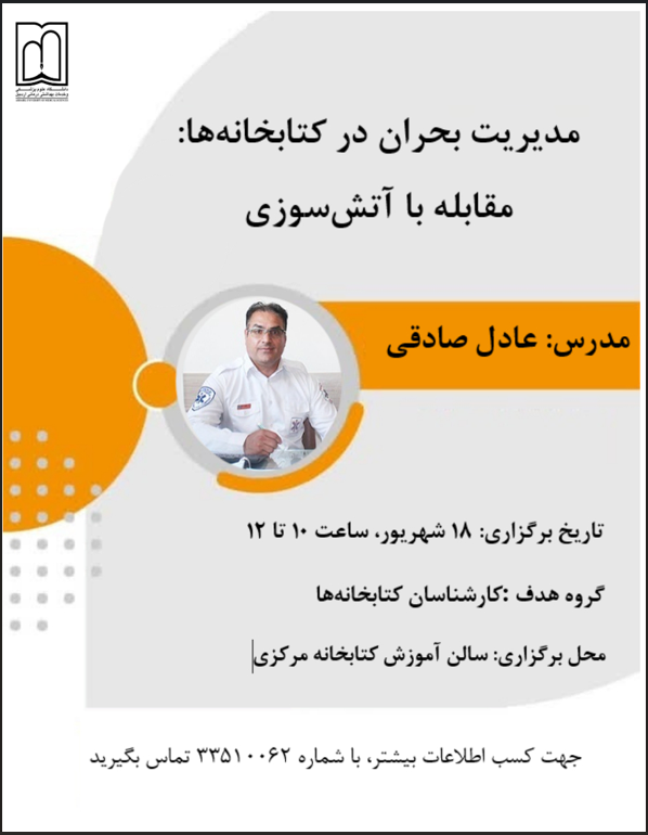 کتابخانه مرکزی با هدف ارتقای آمادگی و ایمنی در محیط کتابخانه، کارگاهی آموزشی با عنوان «مدیریت بحران در کتابخانه: آتشسوزی در کتابخانهها» برگزار میکند. این کارگاه روز چهارشنبه ۱۸ شهریور از ساعت ۱۰ تا ۱۲، ویژه کارکنان کتابخانهها و با تدریس آقای عادل صادقی رییس اداره مدیریت حوادث ، بلایا و پایش مراقبتهای درمانی اورژانس پیش بیمارستانی و EOC دانشگاه، برگزار خواهد شد.